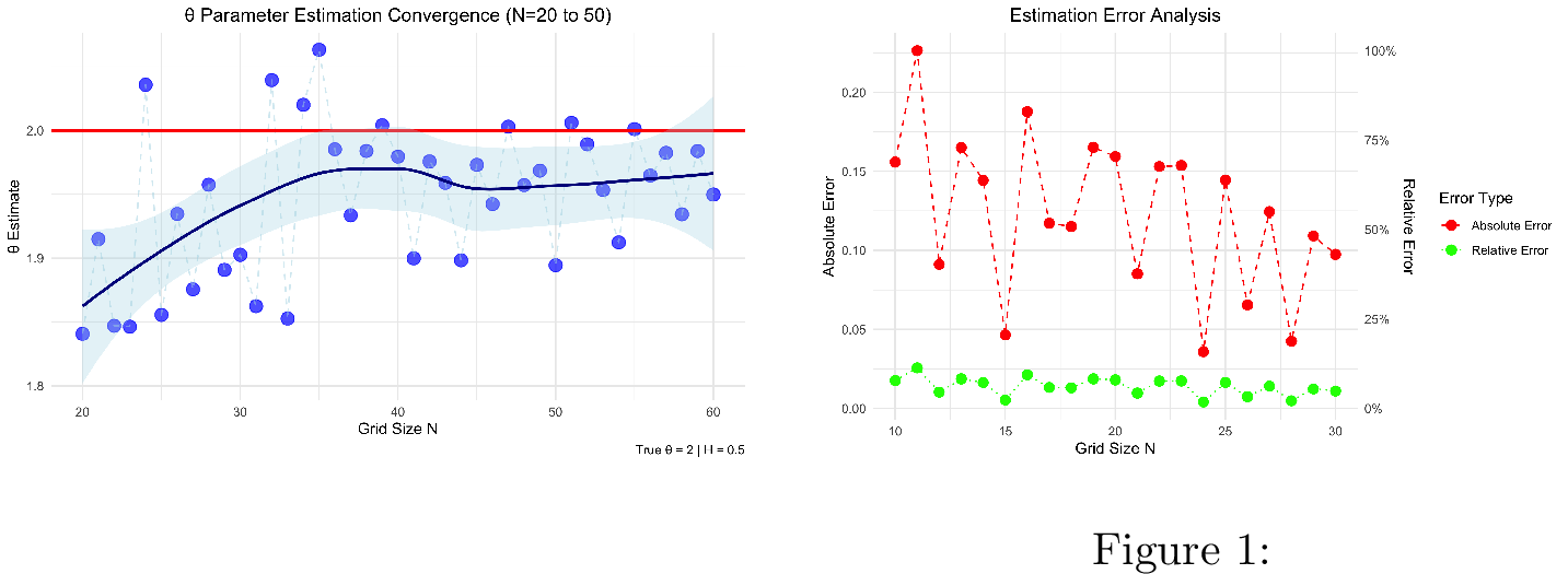 Given the limit in 24 , a natural approach to estimating \(\theta\) is to use the approximation \[\begin{align} \label{eq32appr1} \theta \approx \sqrt{\frac{Q_{N}(v_{\theta}) }{2^{H-\frac{5}{2}} \int_0^1\int_0^1 F^2\big(v_{\theta}(\tau, \lambda) \big) d\tau d\lambda}}. \end{align}\tag{25}\] To evaluate the denominator, we discretize the double integral via a Riemann sum: \[\int_0^1\int_0^1 F^2\big(v(\tau, \lambda) \big) d\tau d\lambda\approx N^{-2} \sum_{i=0}^{N-1} \sum_{j=0}^{N-1} F^2\big(v(\tau_i, \lambda_j) \big).\] This leads to the following estimator for the diffusion parameter \(\theta\): for every \(N\ge1\), \[\begin{align} \label{eq32appr2} \hat{\theta}_N := \sqrt{\frac{Q_{N}(v_{\theta})}{ 2^{H-\frac{5}{2}} N^{-2} \sum_{i=0}^{N-1} \sum_{j=0}^{N-1} F^2\big(v_{\theta}(\tau_i, \lambda_j) \big)}}. \end{align}\tag{26}\]