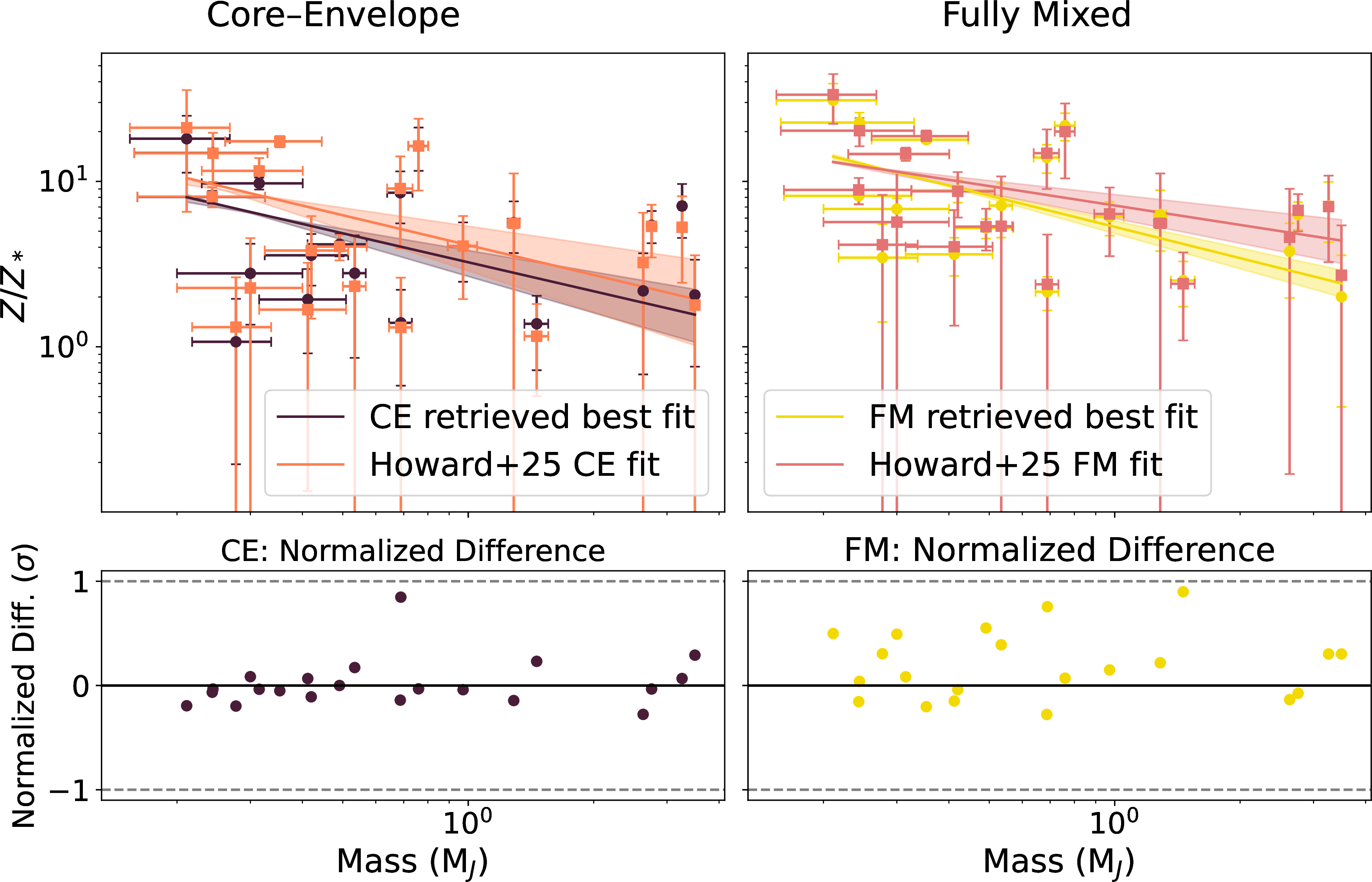 In order to assess the strength and accuracy of the retrieved \(Z\) for the sample used, we took advantage of the fact that the used dataset is the same as the one used by [8]. We thus took the initial sample of 21 exoplanets with the most precise data on Radius (\(R_{err}\)<3%), and compared it with the same planets processed with the method explained in [8]. Results are shown in Fig. ¿fig:fig468?, where a visual comparison between the trends for the \(Z\)/\(Z_{\star}\) vs \(M\) is being shown. To note how the best fit lines vary from the ones retrieved with the full dataset of 44 exoplanets, showing again the variability and unreliability of such curves for model prediction. Howard also discussed in their paper the shift of the slope \(\alpha\) between the dataset considering only \(R_{err}\)<3%, or for the broader range considered of \(R_{err}\)<5%. In the bottom panels of Fig. ¿fig:fig468?, it is shown how we assessed the difference between the data from this paper compared to the ones from [8]. While a simple subtraction could provide information about the difference between the two mean values, we also wanted to investigate whether each ranges of values (so accounting for data uncertainty) lie within each other. To do so, a normalisation using the standard deviations of the data has been computed. The normalised difference can be expressed with the following formula: \[\label{eq4616} \sigma = \frac{\text{Howard} - \text{CE/FM}}{\sqrt{\sigma_{\text{Howard}}^{2} + \sigma_{\text{CE/FM}}^{2}}} .\tag{4}\]