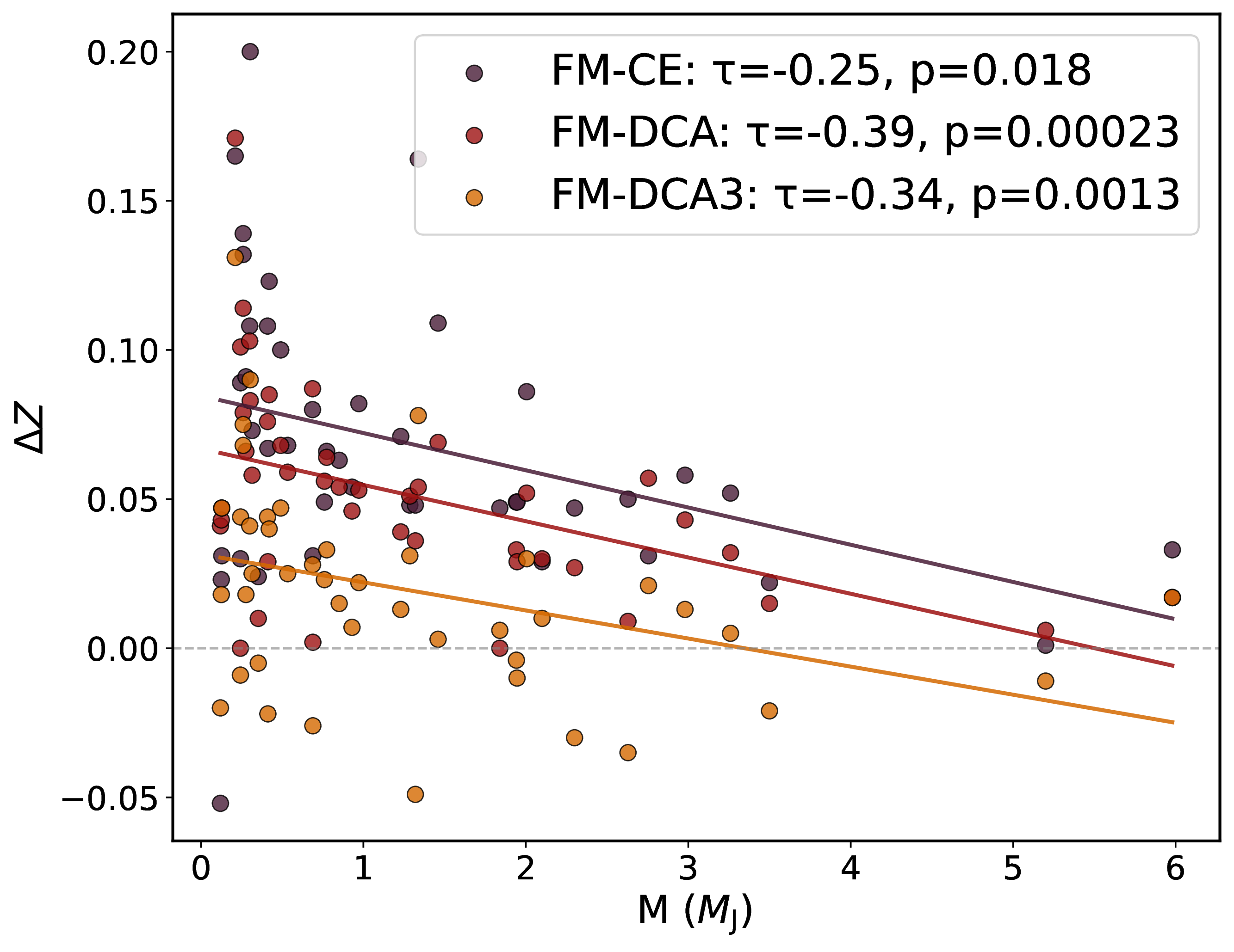 Figure ¿fig:fig468? aims at showing such changes in the assumed structure over the full mass regime of the inspected exoplanets. The three lines show the best-fit lines of the data that is computed by the subtraction between the two mean points according to the models compared. No \(\sigma\) in the models has been accounted for, as only the mean points have been inspected. For this reason, no error protraction has been shown on the best-fit lines, that have been kept only for visual reasons. Nonetheless, without counting model errors, the \(\Delta\) \(Z\) for all three models being compared to FM show statistical validity as shown by the Kendall’s \(\tau\) results (and respective p-values) shown on the Figure’s legend. We can see that, on average, all the models tend to reach 0 (No \(Z\) difference between two structurally different models) in the high-\(M\) regime. While the best-fit line for \(\Delta\) \(Z_{FM-CE}\) approaches zero, for the difference between the FM-DCA and FM-DCA3 goes to the negative (meaning that fully mixed is not anymore the structural endmember, but DCA and DCA3 overpredicts \(Z\) more than FM). This is caused by the forcing of respectively stellar and three times stellar abundances in their structures. Low-\(Z\) scenarios (usually in the high-\(M\) region) will be ‘ruled out’ by forcing an enriched metallicity in the atmosphere. This could suggest that low-\(Z\) are unlikely to be superenriched in heavy elements in their atmospheres. This agrees with the theory exposed in [51]. Further studies must be made to investigate if that is the case, or if degeneracies between mass distribution in massive planets might overshadow the overall magnitude of opacity effect proved to be dominant by this study.
